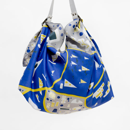 Just thread the corners of the furoshiki through the metal buckles of the strap, pull to tighten and you're done. They don’t damage the fabric so you can easily switch between using your furoshiki as a scarf or a bag. See all our bag sets here